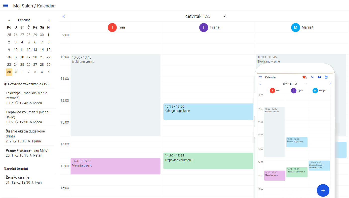 Buker aplikacija je u isto vrijeme i jednostavan i moćan alat sa kalendarom koji podržava zakazivanja u salonu, bilo da su telefonom, uživo, onlajn ili sa društvenih mreža, mobilnim aplikacijama ili sa SrediMe. Dodajte ili pregledajte naredne termine sa bilo kog mjesta!